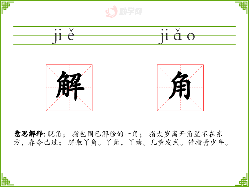 解角的意思是:脱角; 指包围已解除的一角; 指太岁离开角星不在东方,春令已过; 解散丫角。丫角,丫结。儿童发式。借指青少年。
