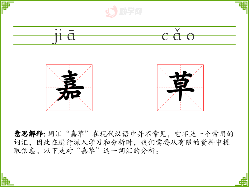 词汇“嘉草”在现代汉语中并不常见,它不是一个常用的词汇,因此在进行深入学习和分析时,我们需要从有限的资料中提取信息。以下是对“嘉草”这一词汇的分析: