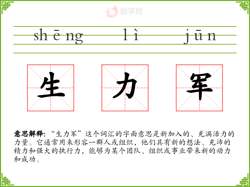 “生力军”这个词汇的字面意思是新加入的、充满活力的力量。它通常用来形容一群人或组织,他们具有新的想法、充沛的精力和强大的执行力,能够为某个团队、组织或事业带来新的动力和成功。