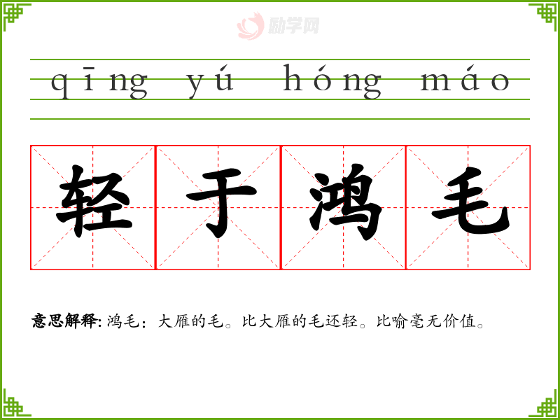 鸿毛:大雁的毛。比大雁的毛还轻。比喻毫无价值。
