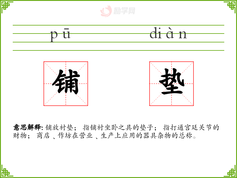 铺垫的意思是:铺放衬垫; 指铺衬坐卧之具的垫子; 指打通宫廷关节的财物; 商店﹑作坊在营业﹑生产上应用的器具杂物的总称。