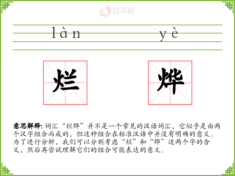 词汇“烂烨”并不是一个常见的汉语词汇,它似乎是由两个汉字组合而成的,但这种组合在标准汉语中并没有明确的意义。为了进行分析,我们可以分别考虑“烂”和“烨”这两个字的含义,然后再尝试理解它们的组合可能表达的意义。