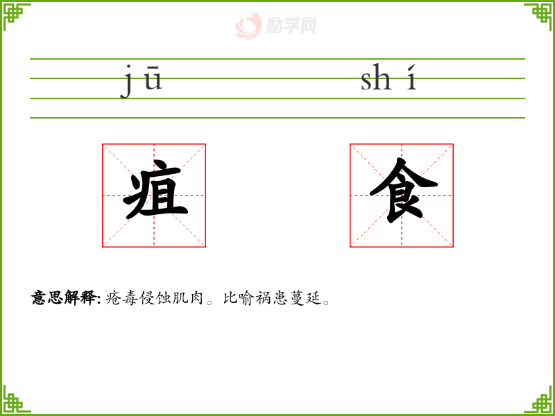 疽食的意思是:疮毒侵蚀肌肉。比喻祸患蔓延。