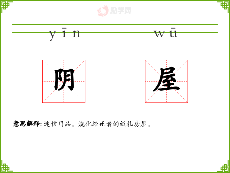 阴屋的意思是:迷信用品。烧化给死者的纸扎房屋。