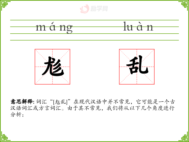 词汇“[尨乱]”在现代汉语中并不常见,它可能是一个古汉语词汇或方言词汇。由于其不常见,我们将从以下几个角度进行分析: