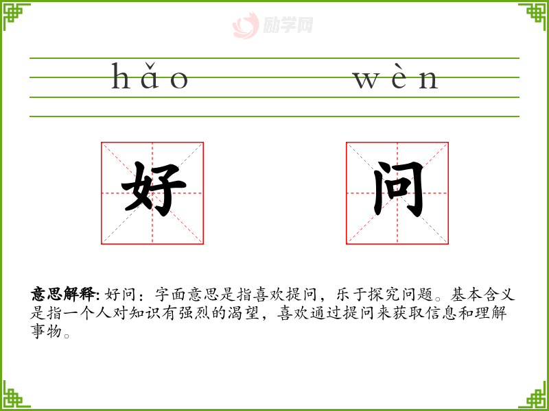 好问:字面意思是指喜欢提问,乐于探究问题。基本含义是指一个人对知识有强烈的渴望,喜欢通过提问来获取信息和理解事物。