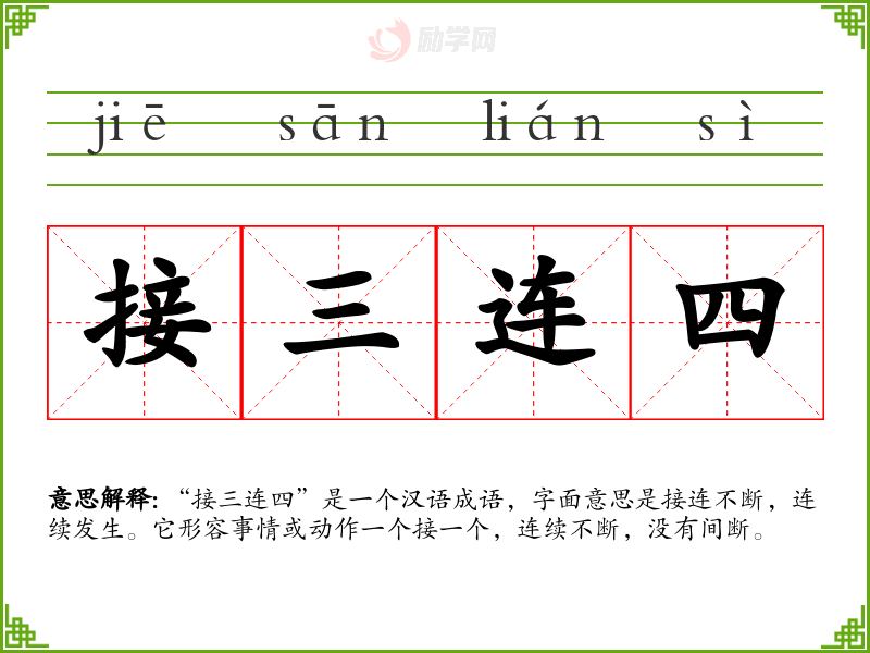 “接三连四”是一个汉语成语,字面意思是接连不断,连续发生。它形容事情或动作一个接一个,连续不断,没有间断。