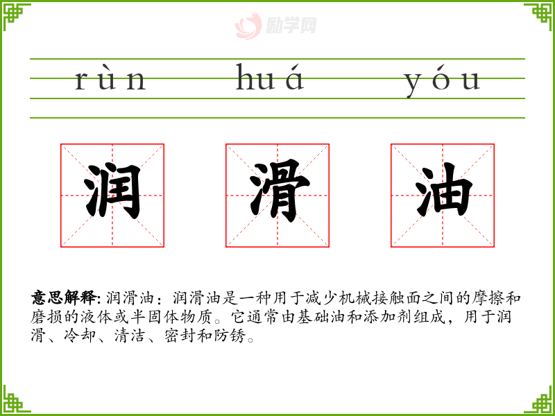 润滑油的意思是:石油产品的一大类。能减少机械摩擦的油状液体。亦具有冷却、防护、密封、绝缘、清洗杂质等作用。由石油经减压蒸馏和脱蜡精制而得。按应用分内燃机油、齿轮油、液压油等。质量由黏度、凝点等指标决定。