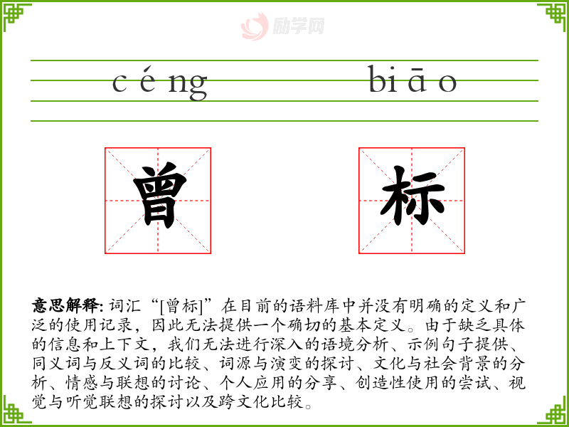词汇“[曾标]”在目前的语料库中并没有明确的定义和广泛的使用记录,因此无法提供一个确切的基本定义。由于缺乏具体的信息和上下文,我们无法进行深入的语境分析、示例句子提供、同义词与反义词的比较、词源与演变的探讨、文化与社会背景的分析、情感与联想的讨论、个人应用的分享、创造性使用的尝试、视觉与听觉联想的探讨以及跨文化比较。
