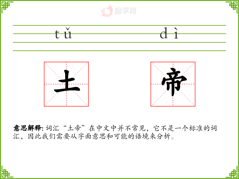 词汇“土帝”在中文中并不常见,它不是一个标准的词汇,因此我们需要从字面意思和可能的语境来分析。
