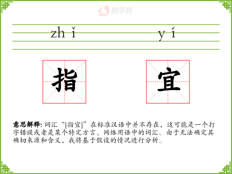 由于“[指宜]”不是一个标准汉语词汇,对其的理解和应用需要依赖于具体的语境和背景知识。在语言学习和表达中,了解和尊重地方方言和特色词汇是丰富语言多样性的重要途径。