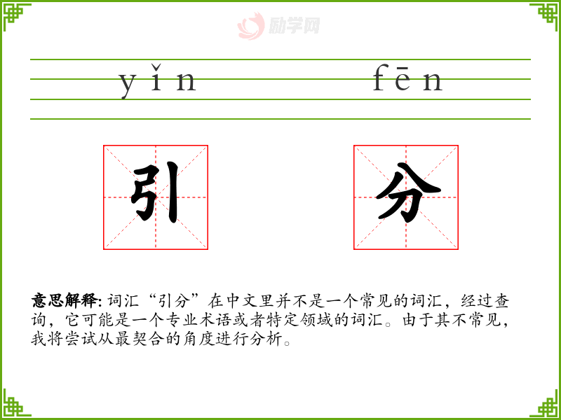 词汇“引分”在中文里并不是一个常见的词汇,经过查询,它可能是一个专业术语或者特定领域的词汇。由于其不常见,我将尝试从最契合的角度进行分析。