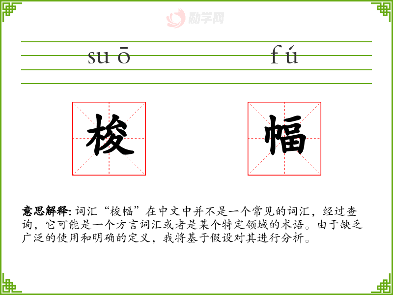 由于“梭幅”不是一个常见的词汇,对其的理解和应用可能局限于特定的领域或文化背景。在学*语言时,了解这些特定术语有助于丰富词汇量和理解不同行业的专业知识。