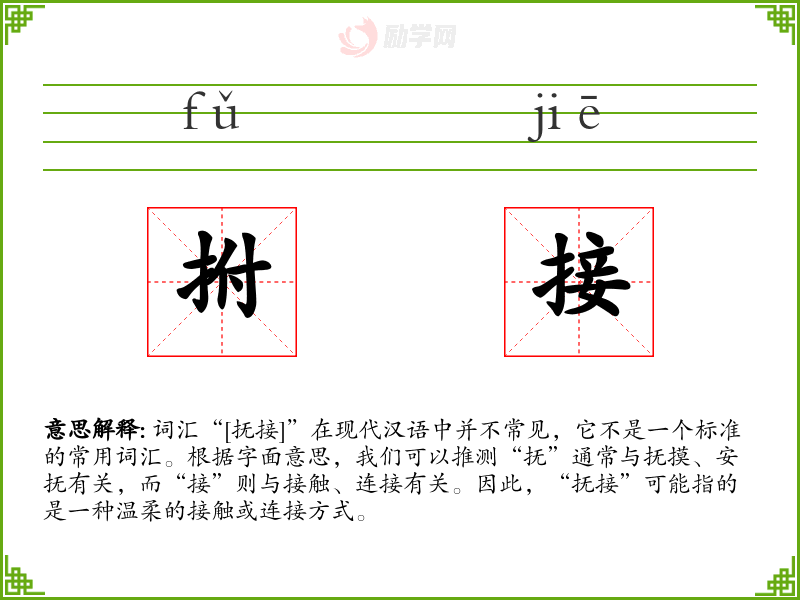 词汇“[抚接]”在现代汉语中并不常见,它不是一个标准的常用词汇。根据字面意思,我们可以推测“抚”通常与抚摸、安抚有关,而“接”则与接触、连接有关。因此,“抚接”可能指的是一种温柔的接触或连接方式。