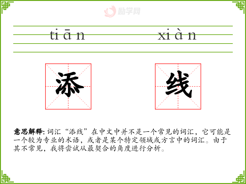 词汇“添线”在中文中并不是一个常见的词汇,它可能是一个较为专业的术语,或者是某个特定领域或方言中的词汇。由于其不常见,我将尝试从最契合的角度进行分析。