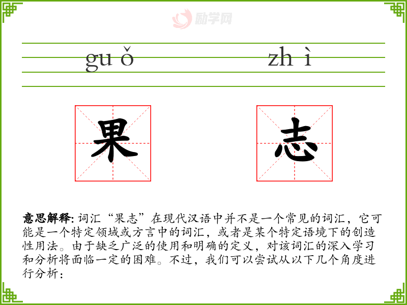 由于“果志”不是一个标准词汇,我们无法总结对其的理解,也无法反思其在语言学习和表达中的重要性。