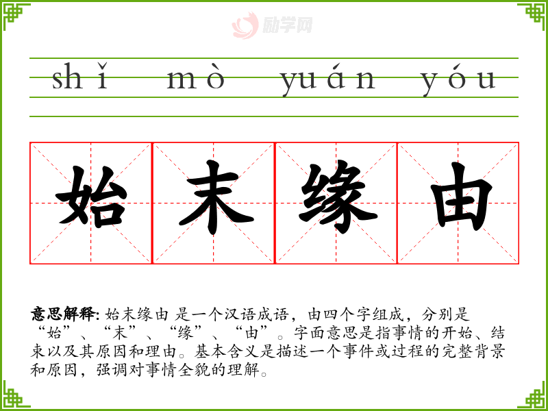 - 反义词:片面之词、断章取义(这些词强调不全面或不准确的理解,与“始末缘由”的全面性相对)