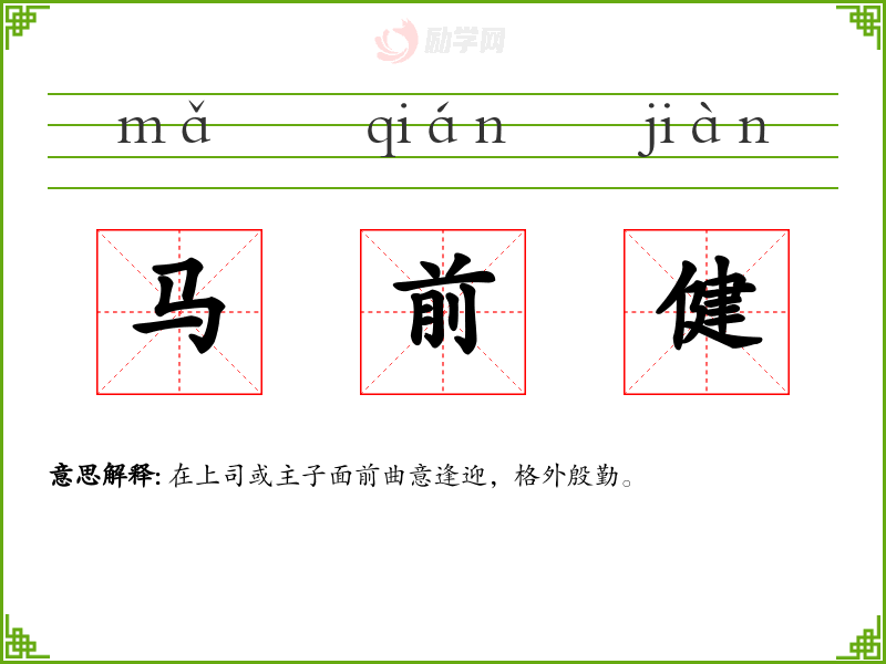马前健的意思是:在上司或主子面前曲意逢迎,格外殷勤。