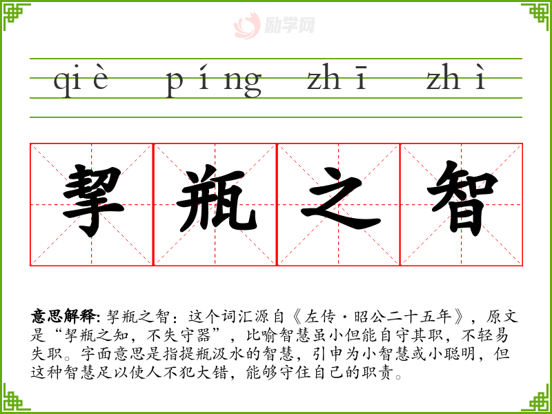 挈瓶之智:这个词汇源自《左传·昭公二十五年》,原文是“挈瓶之知,不失守器”,比喻智慧虽小但能自守其职,不轻易失职。字面意思是指提瓶汲水的智慧,引申为小智慧或小聪明,但这种智慧足以使人不犯大错,能够守住自己的职责。