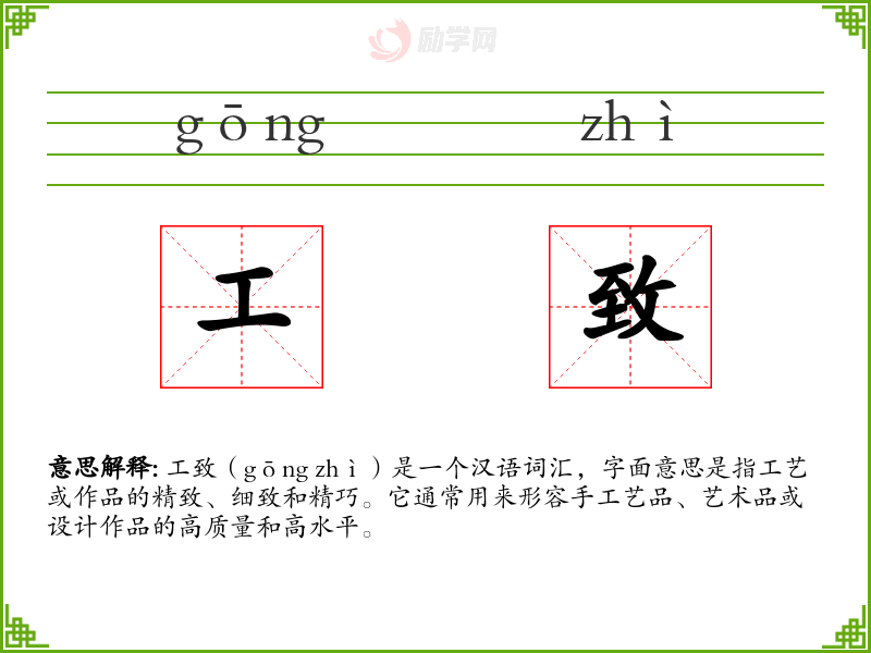 工致(gōng zhì)是一个汉语词汇,字面意思是指工艺或作品的精致、细致和精巧。它通常用来形容手工艺品、艺术品或设计作品的高质量和高水平。
