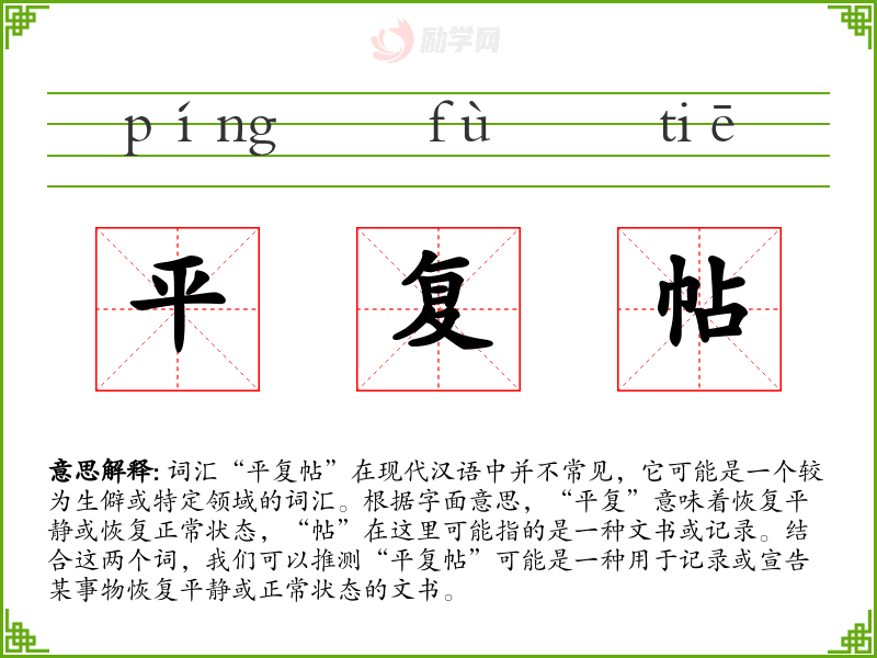 由于“平复帖”不是一个常见词汇,它在不同语境下的使用可能较为有限。在历史文献或特定专业领域(如法律、历史研究)中,可能会遇到这样的词汇。