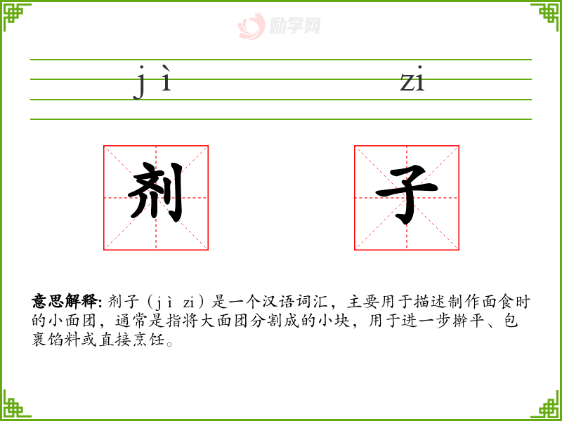 剂子的意思是:做馒头、饺子等的时候,从和(huó)好了的长条形的面上分出来的小块儿。