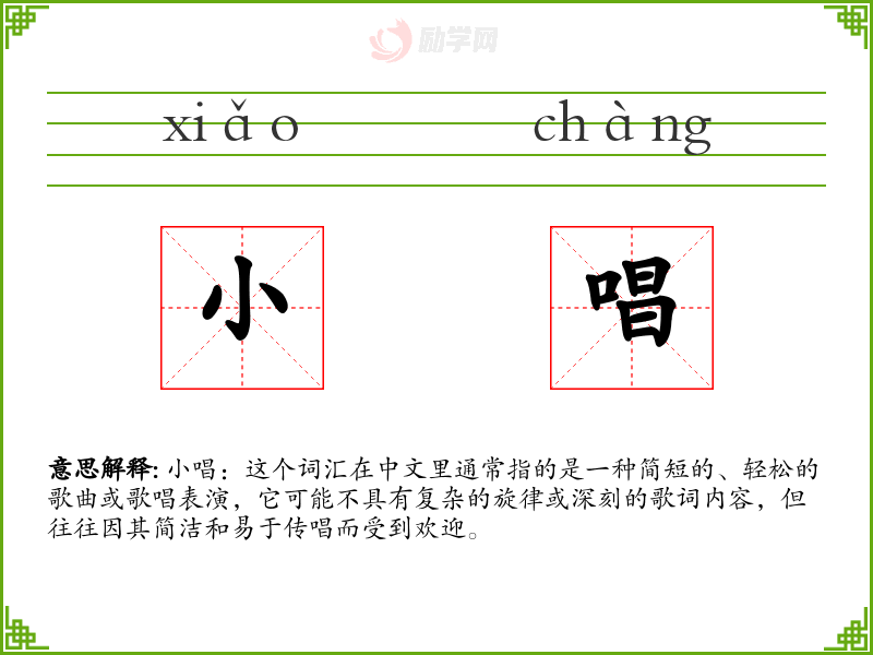 小唱:这个词汇在中文里通常指的是一种简短的、轻松的歌曲或歌唱表演,它可能不具有复杂的旋律或深刻的歌词内容,但往往因其简洁和易于传唱而受到欢迎。