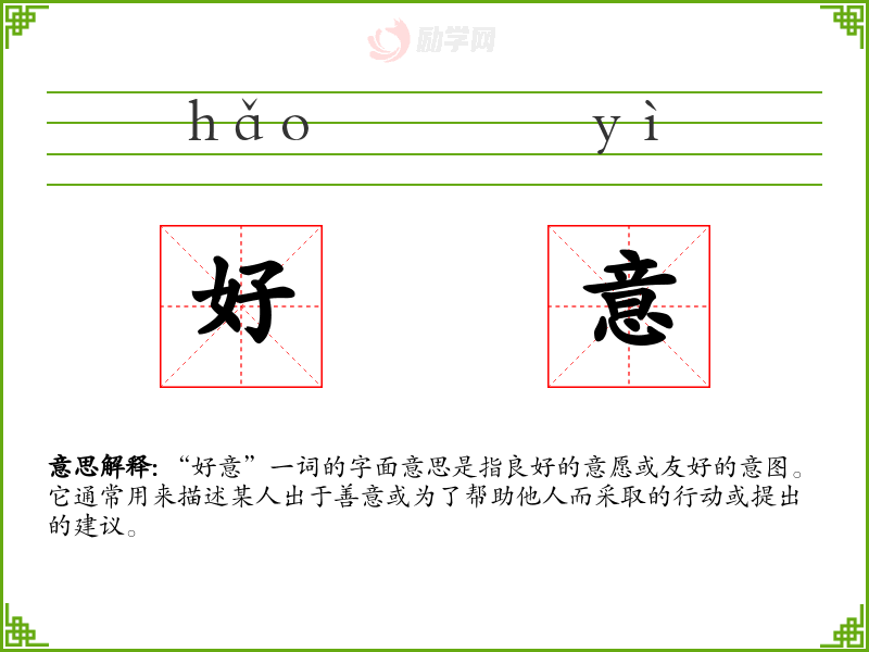 “好意”一词的字面意思是指良好的意愿或友好的意图。它通常用来描述某人出于善意或为了帮助他人而采取的行动或提出的建议。