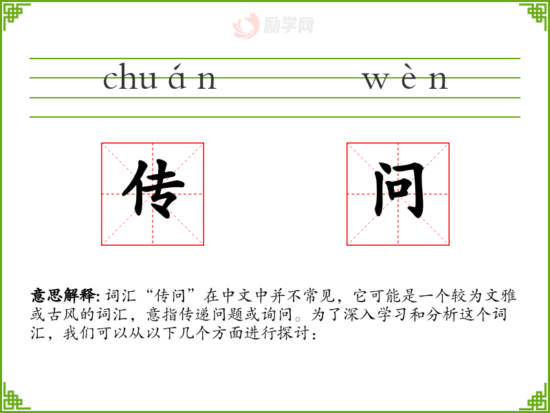 词汇“传问”在中文中并不常见,它可能是一个较为文雅或古风的词汇,意指传递问题或询问。为了深入学*和分析这个词汇,我们可以从以下几个方面进行探讨: