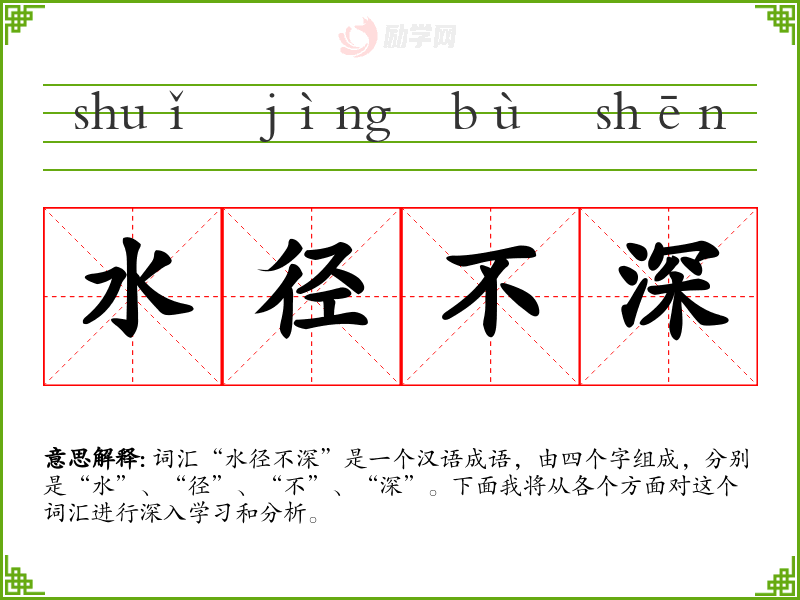 通过对“水径不深”这个词汇的深入学,我认识到它在描述事物表面现象时的简洁性和实用性。在语言学和表达中,理解并正确使用这样的成语可以增强表达的准确性和丰富性。