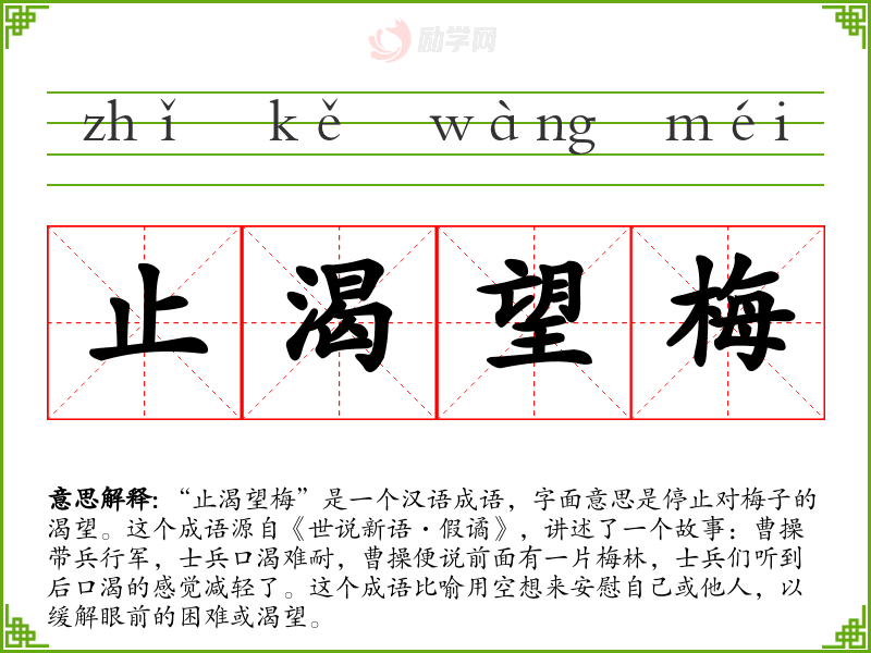 在文学作品中,“止渴望梅”常用来形容人们在困境中寻找精神上的慰藉。在口语中,这个成语可以用来形容某人用不切实际的希望来安慰自己。在专业领域,如心理学,这个成语可以用来描述一种自我欺骗的行为。