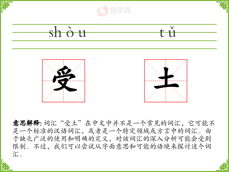 由于“受土”不是一个常见的词汇,对其的理解和应用可能非常有限。在语言学习和表达中,了解和掌握常见和标准的词汇更为重要。如果“受土”在某个特定领域或方言中使用,了解其具体含义和用法将有助于更好地理解和应用该词汇。