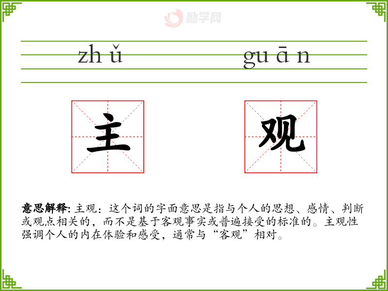 “主观”这个词在理解和表达个人经验方面非常重要。它提醒我们在交流中要考虑到个体差异,并在追求客观性的同时,尊重和理解他人的主观感受。