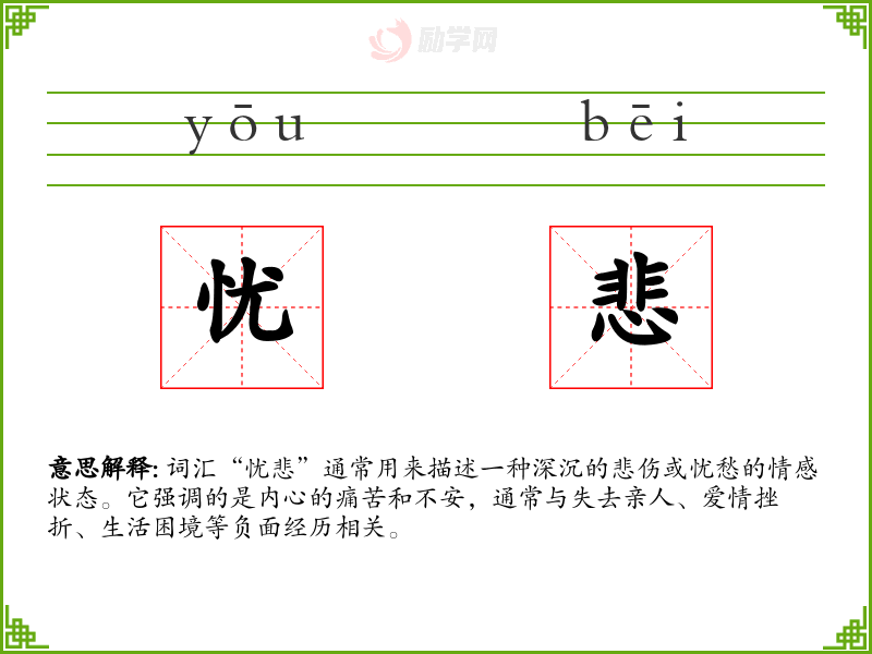 词汇“忧悲”通常用来描述一种深沉的悲伤或忧愁的情感状态。它强调的是内心的痛苦和不安,通常与失去亲人、爱情挫折、生活困境等负面经历相关。