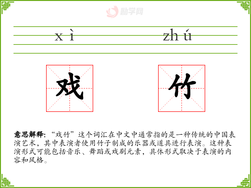 通过对“戏竹”的学和分析,我更加深刻地理解了这一传统艺术形式的文化意义和审美价值。它不仅是一种表演艺术,更是一种文化传承和创新的体现。在未来的语言学和表达中,我将更加注重对这类传统词汇的理解和运用,以丰富我的语言表达和文化视野。