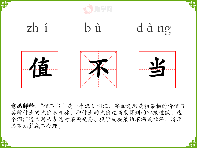 “值不当”是一个汉语词汇,字面意思是指某物的价值与其所付出的代价不相称,即付出的代价过高或得到的回报过低。这个词汇通常用来表达对某项交易、投资或决策的不满或批评,暗示其不划算或不合理。