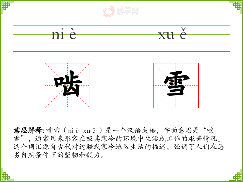 - 反义词:锦衣玉食(形容生活奢华舒适,与啮雪的艰苦形成鲜明对比)