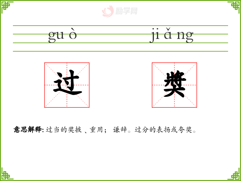 过奬的意思是:过当的奖掖﹑重用; 谦辞。过分的表扬或夸奖。