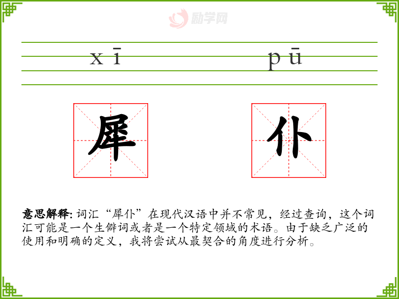 由于“犀仆”不是一个常见的词汇,我们无法提供一个确切的基本定义。它可能是由“犀”和“仆”两个字组合而成的复合词,其中“犀”可能指的是犀牛,而“仆”通常指的是仆人或服务人员。因此,“犀仆”可能指的是与犀牛有关的服务人员或仆人,但这只是一个猜测。