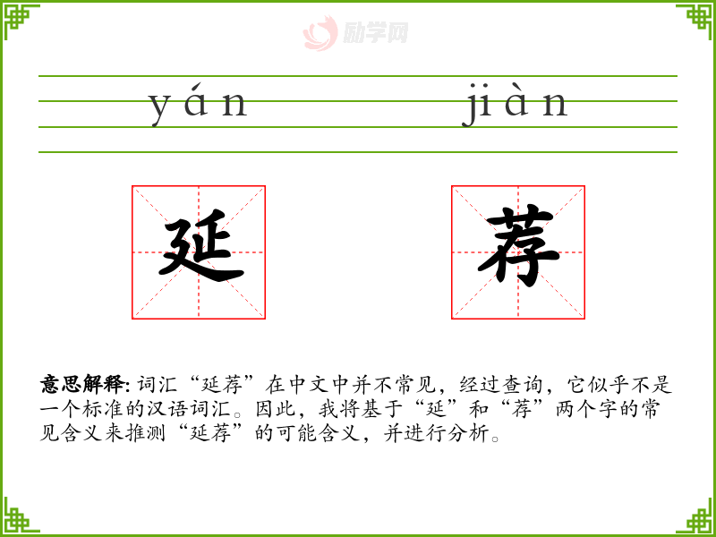 词汇“延荐”在中文中并不常见,经过查询,它似乎不是一个标准的汉语词汇。因此,我将基于“延”和“荐”两个字的常见含义来推测“延荐”的可能含义,并进行分析。