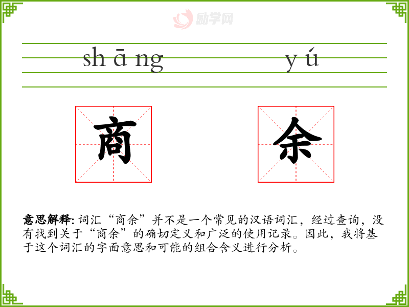 “商余”字面意思可能是指商业活动之后的剩余部分,或者是在商业交易中未被完全利用的部分。然而,由于缺乏具体的使用实例,这个定义仅仅是基于字面组合的推测。