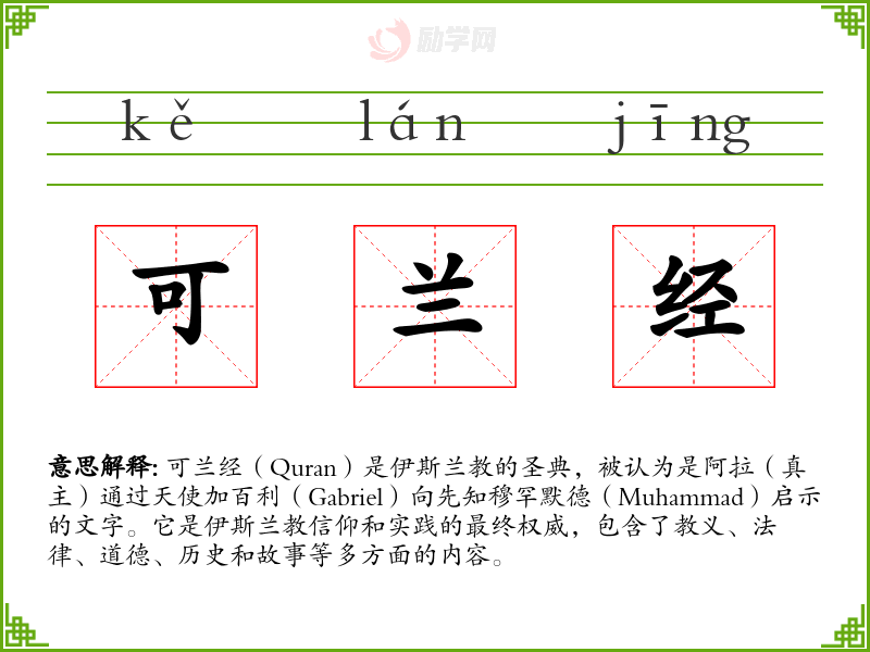 “可兰经”一词源自阿拉伯语“القرآن”(al-Qur'an),意为“诵读”。它最初是通过口头传诵的方式传播,后来被记录成书。随着伊斯兰教的传播,可兰经也被翻译成多种语言。