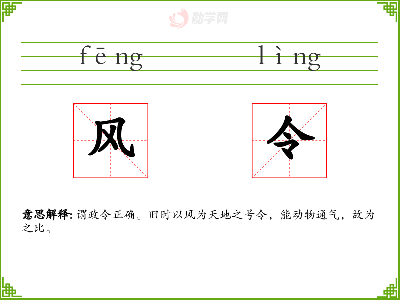 风令的意思是:谓政令正确。旧时以风为天地之号令,能动物通气,故为之比。