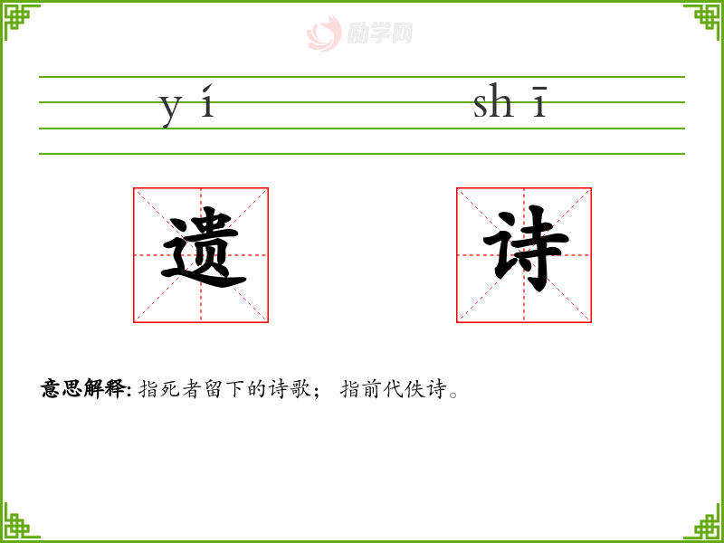 遗诗的意思是:指死者留下的诗歌; 指前代佚诗。