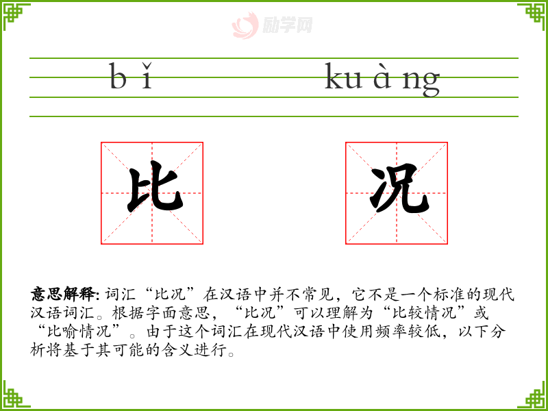 词汇“比况”在汉语中并不常见,它不是一个标准的现代汉语词汇。根据字面意思,“比况”可以理解为“比较情况”或“比喻情况”。由于这个词汇在现代汉语中使用频率较低,以下分析将基于其可能的含义进行。