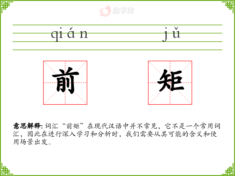 词汇“前矩”在现代汉语中并不常见,它不是一个常用词汇,因此在进行深入学习和分析时,我们需要从其可能的含义和使用场景出发。