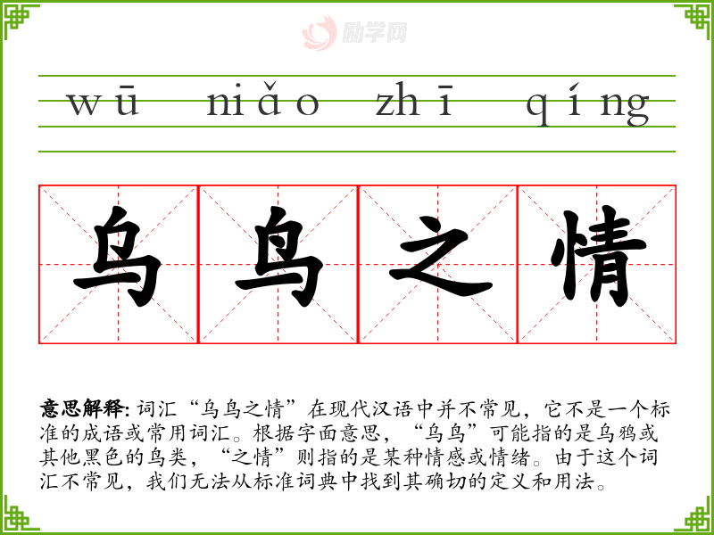 由于“乌鸟之情”不是一个标准词汇,我们无法提供一个确切的基本定义。它可能是某个特定文学作品或方言中的词汇,或者是某个特定社群中的隐喻表达。