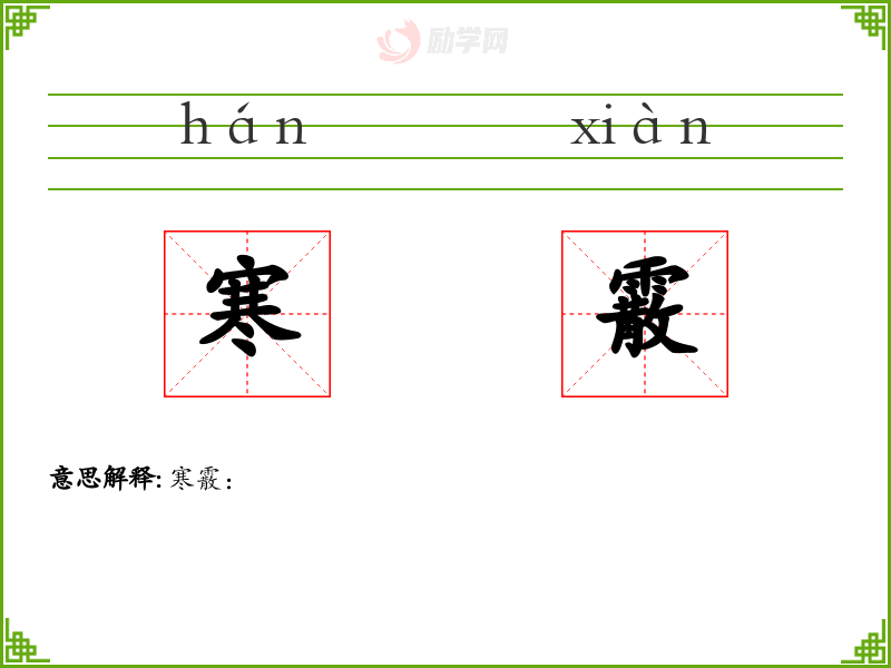 《说文》-寒,冻也。 《列子·汤问》注-凉是冷之始,寒是冷之极。 《易·说卦》-乾为寒。 《左传·哀公十二年》-若不可寻也,亦可寒也。 《左传·昭公四年》-以享司寒。 《吕氏春秋·有始》-北方曰寒风。 《论语·子罕》-岁寒,然后知松柏之后凋也。 《庄子·德充符》-饥渴寒暑,是事之变。 《乐府诗集·木兰诗》-寒光照铁衣。 唐·王昌龄《芙蓉楼送辛渐》-寒雨连江夜入吴。 唐·柳宗元《至小丘西小石潭记》-凄神寒骨。 唐·白居易《卖炭翁》-心忧炭贱愿天寒。