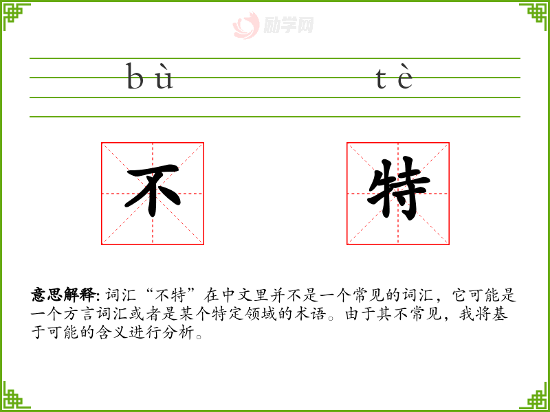 词汇“不特”在中文里并不是一个常见的词汇,它可能是一个方言词汇或者是某个特定领域的术语。由于其不常见,我将基于可能的含义进行分析。