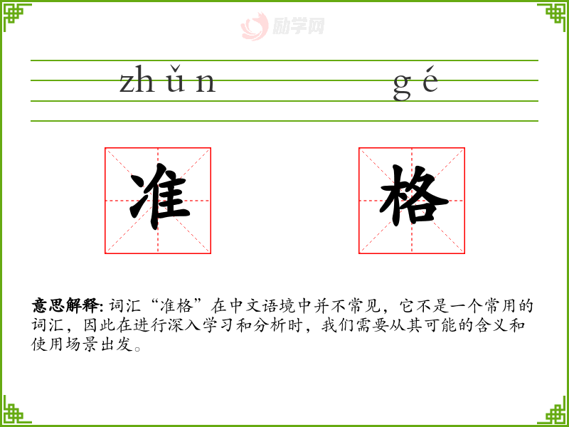 词汇“准格”在中文语境中并不常见,它不是一个常用的词汇,因此在进行深入学习和分析时,我们需要从其可能的含义和使用场景出发。